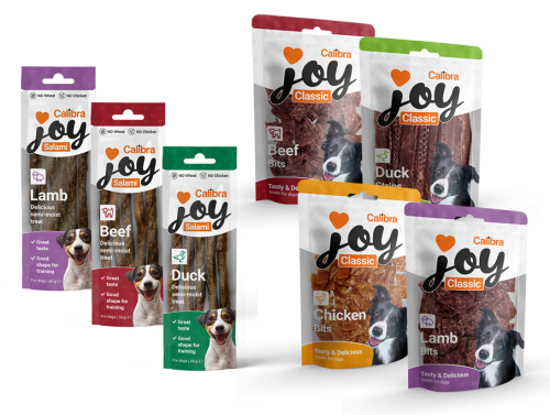 Elke hond verdient een beloning. Dat kan met de lekkere, gezonde vleessnoepjes van Calibra Joy in verschillende smaken en vormen.